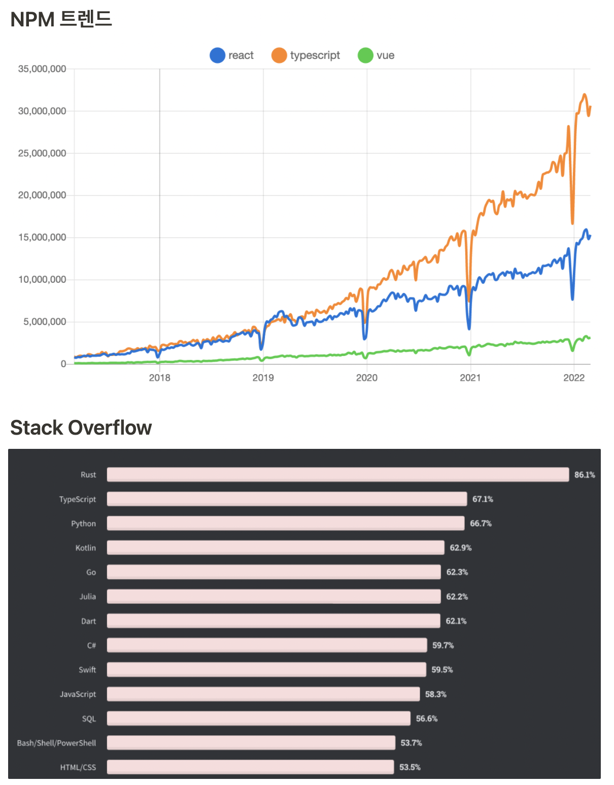 위의 이유 외에도 여러 장점이 있기 때문에 TypeScript의 인기는 Vanila JavaScript를 넘어서고 있다.